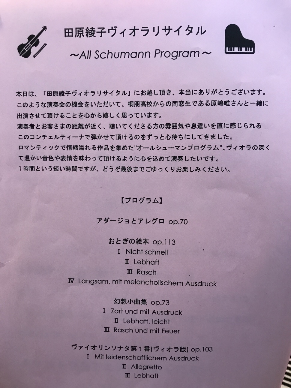 シューマンのロマンチックで不思議な世界と、ヴィオラの深い音色を存分に味わう事ができた、1時間でした。