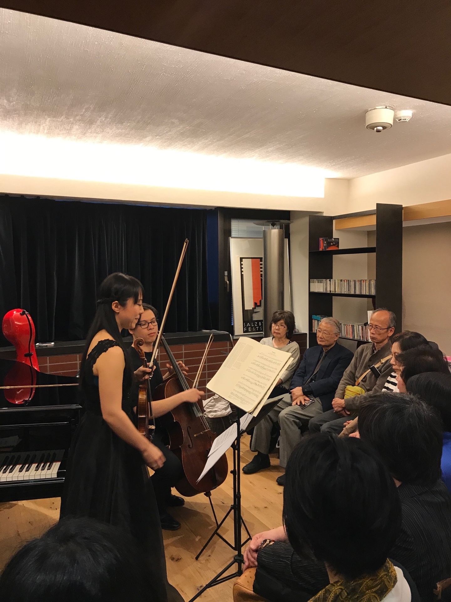 まずはラヴェルのヴァイオリンとチェロのためのDUO。ラヴェルの曲の中でも上級者向けとの事。慶子さん、予め聴きどころをレクチャーして下さいました。4人のメンバーの中でも気が合う二人のDUO、僅か22人で独り占めするのが勿体ないほど素晴らしい演奏でした。