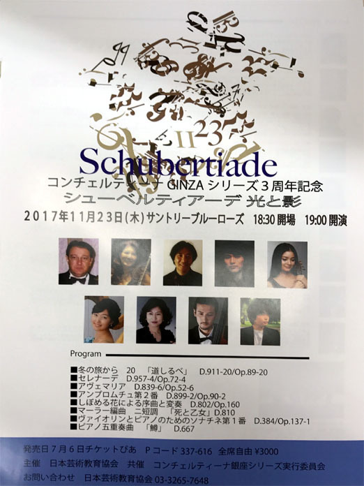コンチェルティーナ3周年を記念して、世界に羽ばたく若手演奏家が集い、シューベルトの室内楽を集めたコンサートをサントリーブルーローズで行いました。
