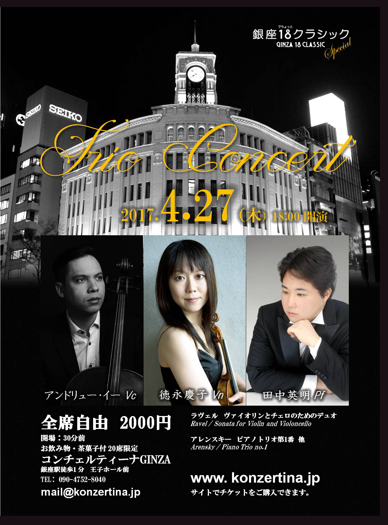 銀座18(でちょっと)クラシック special !と題し、今ニューヨークで最も熱い、アタッカカルテットのヴァイオリン徳永慶子さん& チェロのアンドリュー・イーをお招きして特別に平日夕方からの会となりました。アタッカカルテットは、今アメリカで最も注目されている弦楽四重奏。数々のコンクールで優勝、世界各国で演奏活動を展開しています。今回の日本ツアーでは、名古屋、横浜、大阪公演で、常識をくつがえすエキサイティングな演奏で、連日満員、絶賛されました。そんな多忙な中、メンバーの徳永さんとアンドリュー・イーが東京の室内楽ファンのために、1回限り、限定20名の特別コンサートを開いてくれる事になりました。コンチェルティーナでのトリオ開催は初めて。ドキドキワクワク、期待が高まります!