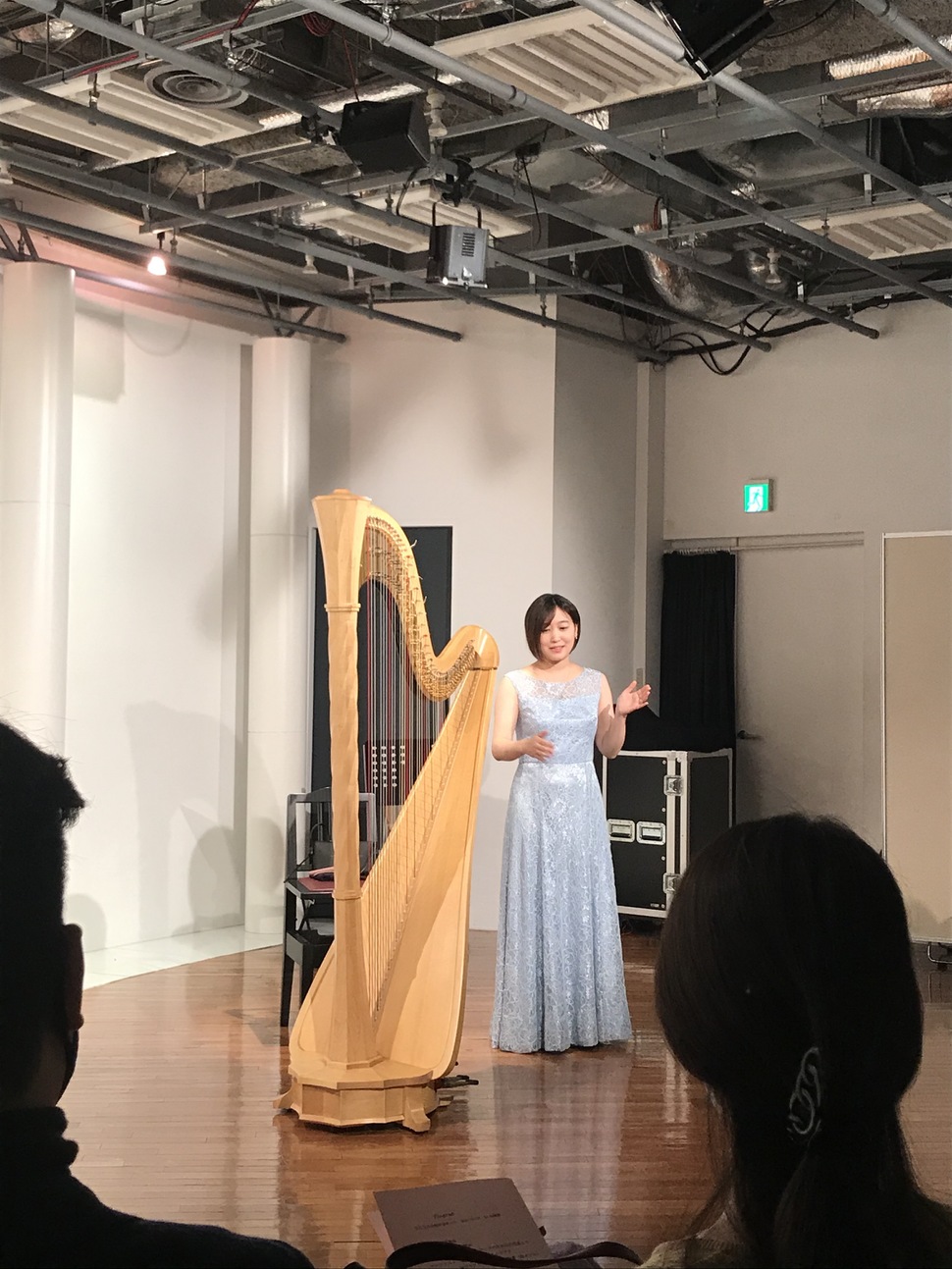 休憩を挟み、第二部は有馬律子さんのハープソロで、ドビュッシー:アラベスク第一番から始まりました。優雅に見えるハープは実は7本のペダルを足で操る重労働。その仕組みを解説してくれました。